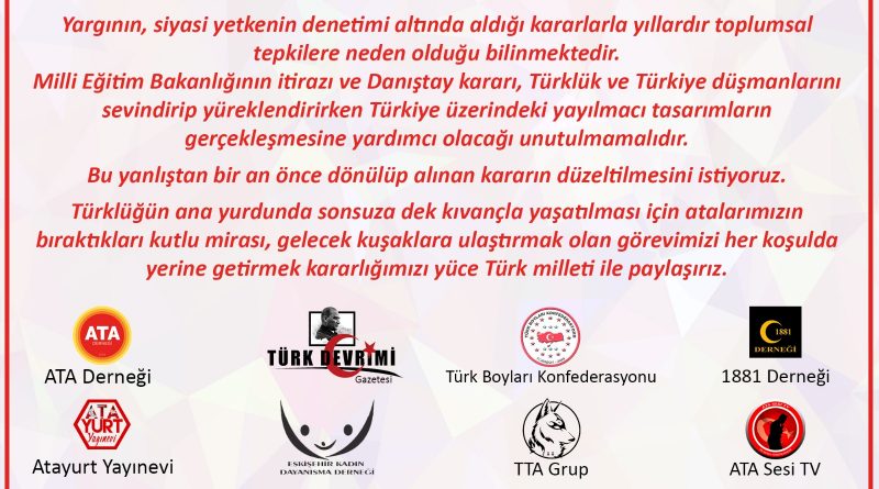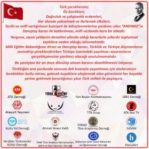BizdenKatagorisizSiyasetTürk Dünyası Yüce Türk milletine 17 Mart 2021 editör Türk çocuklarının Andımızı okullarımızda okumasının yasaklanması ile ilgili aralarında Dilde Fikirde İşte Birlik Yolu Derneği’ninde yer aldığı Sivil Toplum Kuruluşlarının Yüce Türk milletine ortak açıklamasıdır.