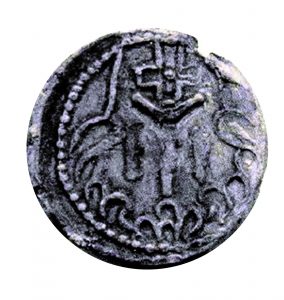 Bulgaristan’da bulunan kurşun mühür. Orion’u, yani Oğuz Kağanı sembolize eden Üç Ok ve Yay sembolü, Kayı boyunun da tamgasıdır. Bu sembolün üzerindeki artı (+) işareti Mitolog Campbell’a göre, Orion Takımyıldızı’nın ikonografisidir.